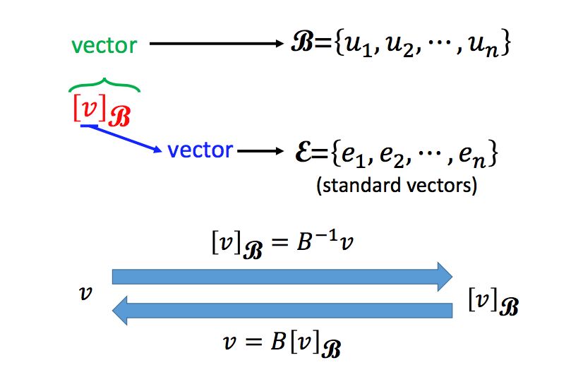 那么,如何得到某一向量在任意坐标系下的坐标,两边同乘B-1即可: