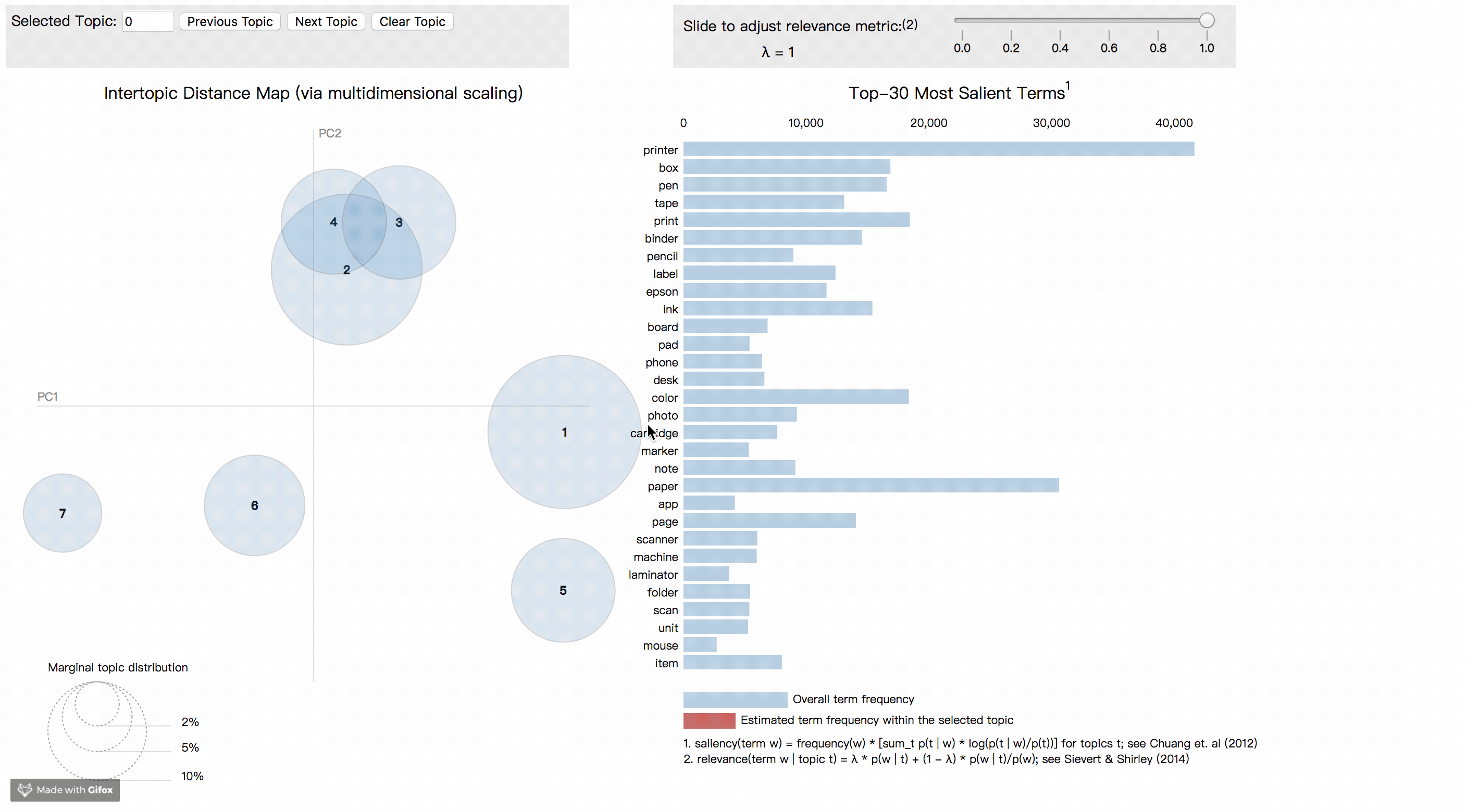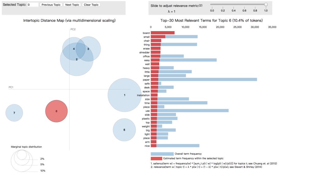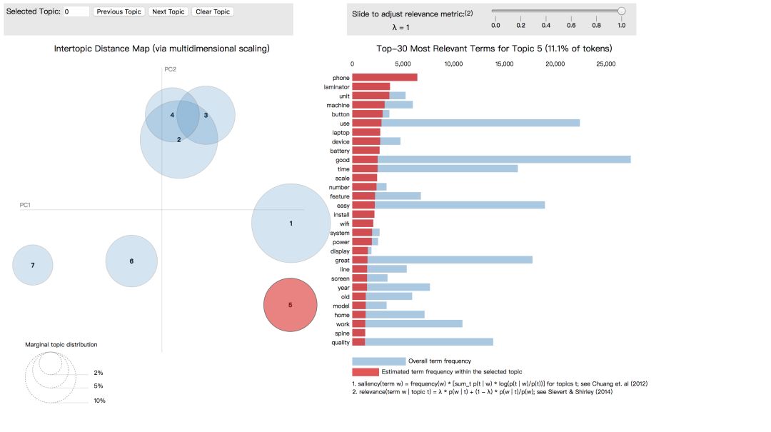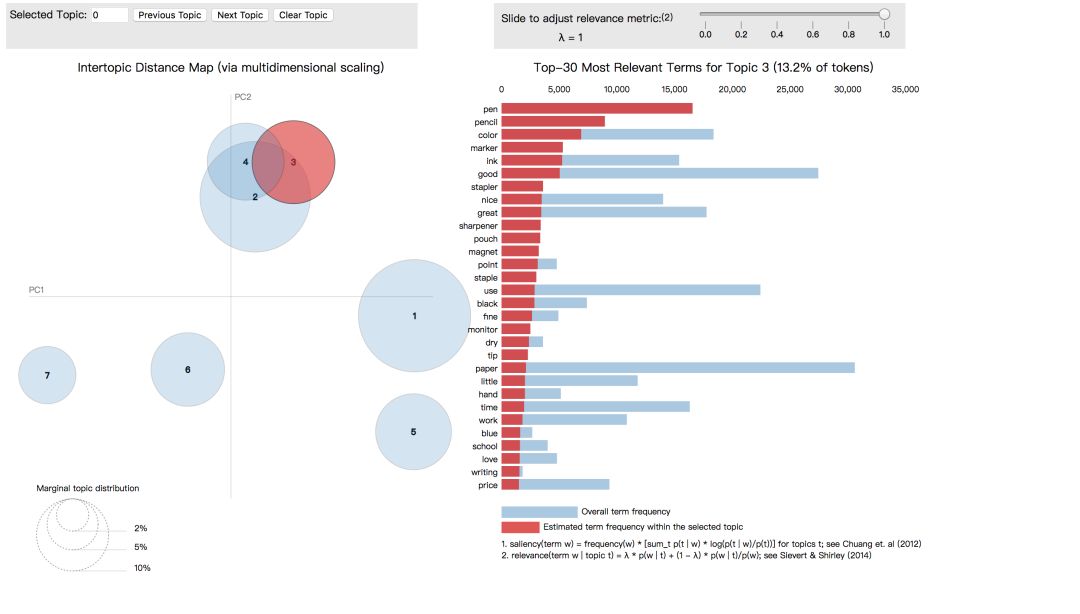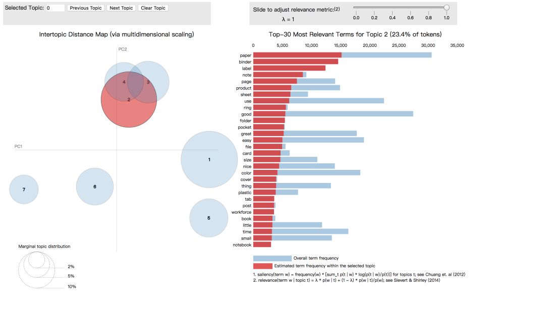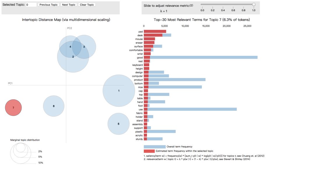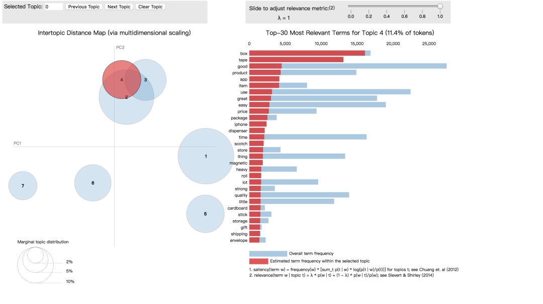 最后,我们利用pyLDAvis库进行主题可视化,以交互式的方式显示我们得到的商品评论主题及其相关的单词。