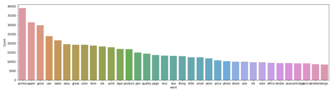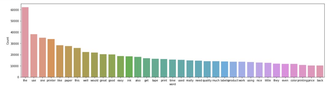 可以看到诸如printer、paper、price这样的与办公产品相关的词汇已经有所显现,这些词语是我们希望看到的,但是还存在着许多不相关的单词如the、this等,需要进一步过滤。