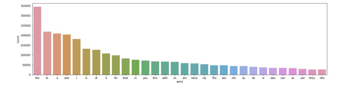 可以看出,原始的评论数据中词频最高的为"the"、"to"、"a"等对我们的文本挖掘没有价值的词汇,我们会在数据预处理的过程中将它们过滤掉。