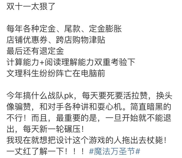 今年“双十一”延续了去年烧脑的风格,复杂的优惠规则既考验数学功底又考验阅读理解能力,但这仍然没能浇灭剁手党的热情,“集能量组战队”的玩家们依旧打得火热。