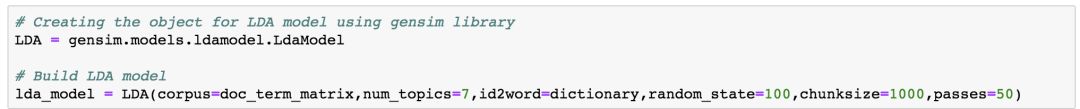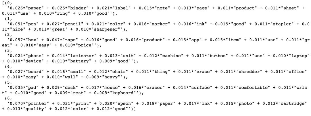 在这里,我将主题参数指定为7,经过(很长)一段时间的代码运行时间就可以得到主题模型了。