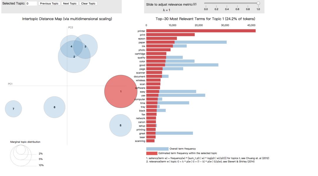 可以看到主题1里出现的高频词汇为“printer”“ink” “paper”等,这似乎是在谈论与打印有关的主题。