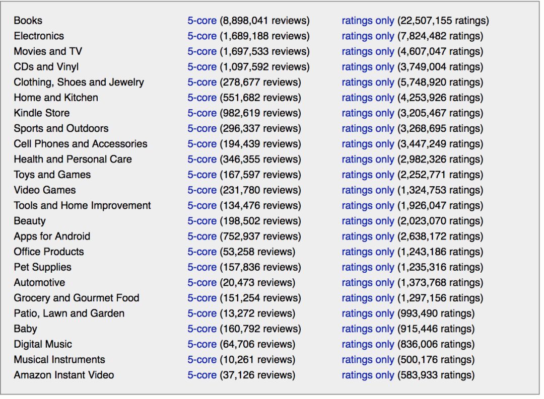 我们选择了使用亚马逊购物网站的“办公产品”类别的商品评论数据集来完成这个任务,类似的商品评论数据也可以在此下载: