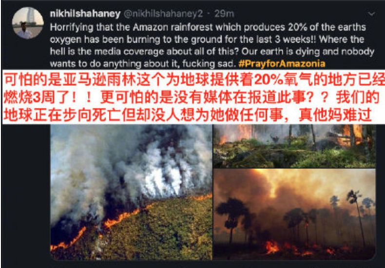 他们在网上通过图片传递自己的愤怒——雨林已经烧成那个样子,雨林中的动物已经四散逃窜,为什么媒体和政府不关注?出发点虽好,但可惜的是,这场环保动员中被广泛传播的图片,有很多与事件本身并无关联。