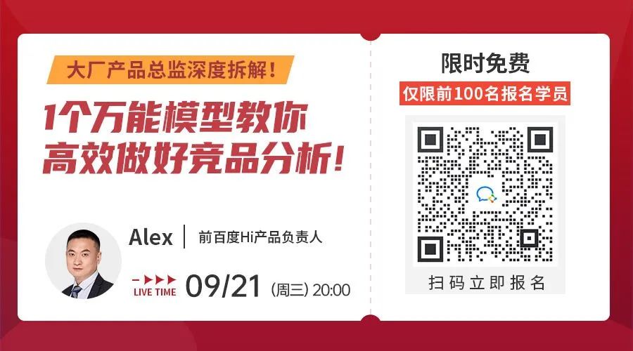 下周三(9月21日)晚上8点,前百度Hi产品负责人@Alex,教你1个万能模型,助你高效做好竞品分析!