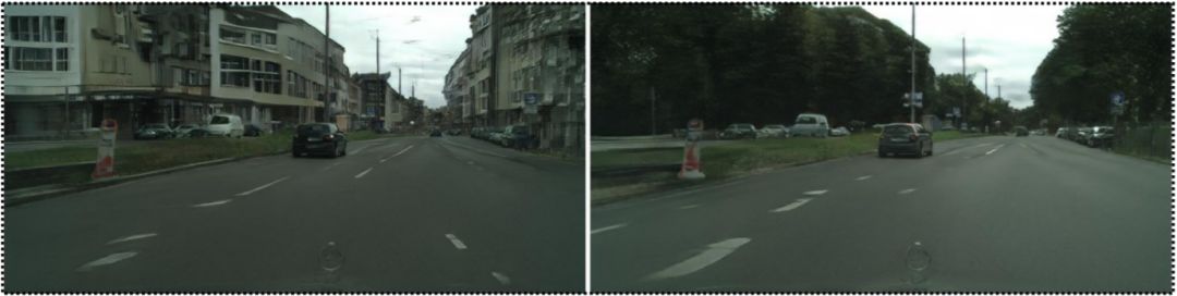 图 1:Cityscapes 结果。其中左上为输入图像、右上为 pix2pixHD 生成的图像、左下为 COVST 生成的图像、右下为本论文提出方法生成的图像。