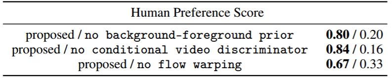 表 2:控制变量研究。作者对比了提出的方法和 3 个变体的性能。分别是初始 vs 无背景-前景先验;初始 vs 无条件视频判别器;初始 vs 无流扭曲。