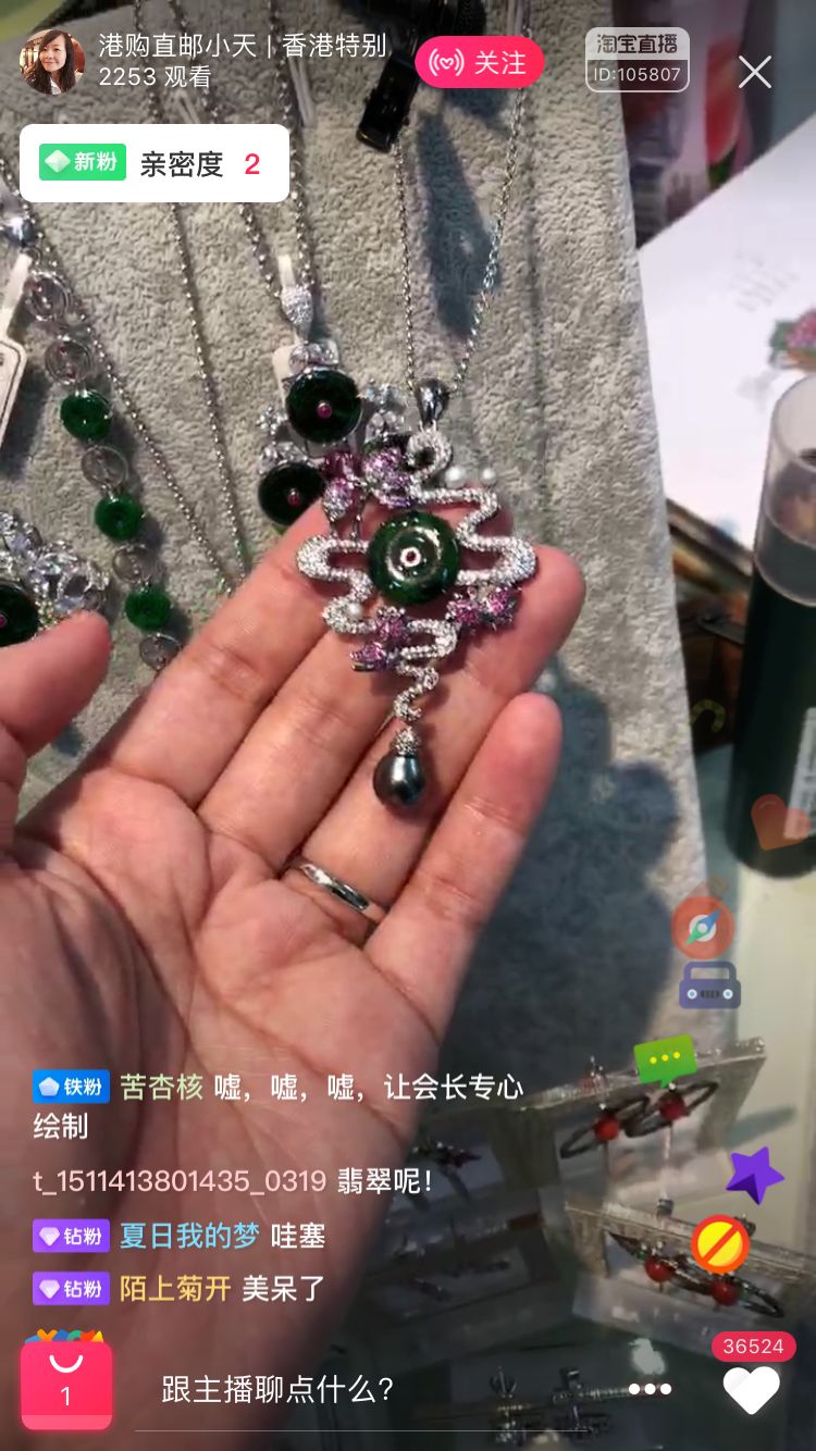 一个工作日下午,香港珠宝买手小天打开淘宝直播,语气亲昵地管顾客们叫“宝宝”,时不时举起手边的珠宝在镜头下展示,并配合弹幕进行试戴: