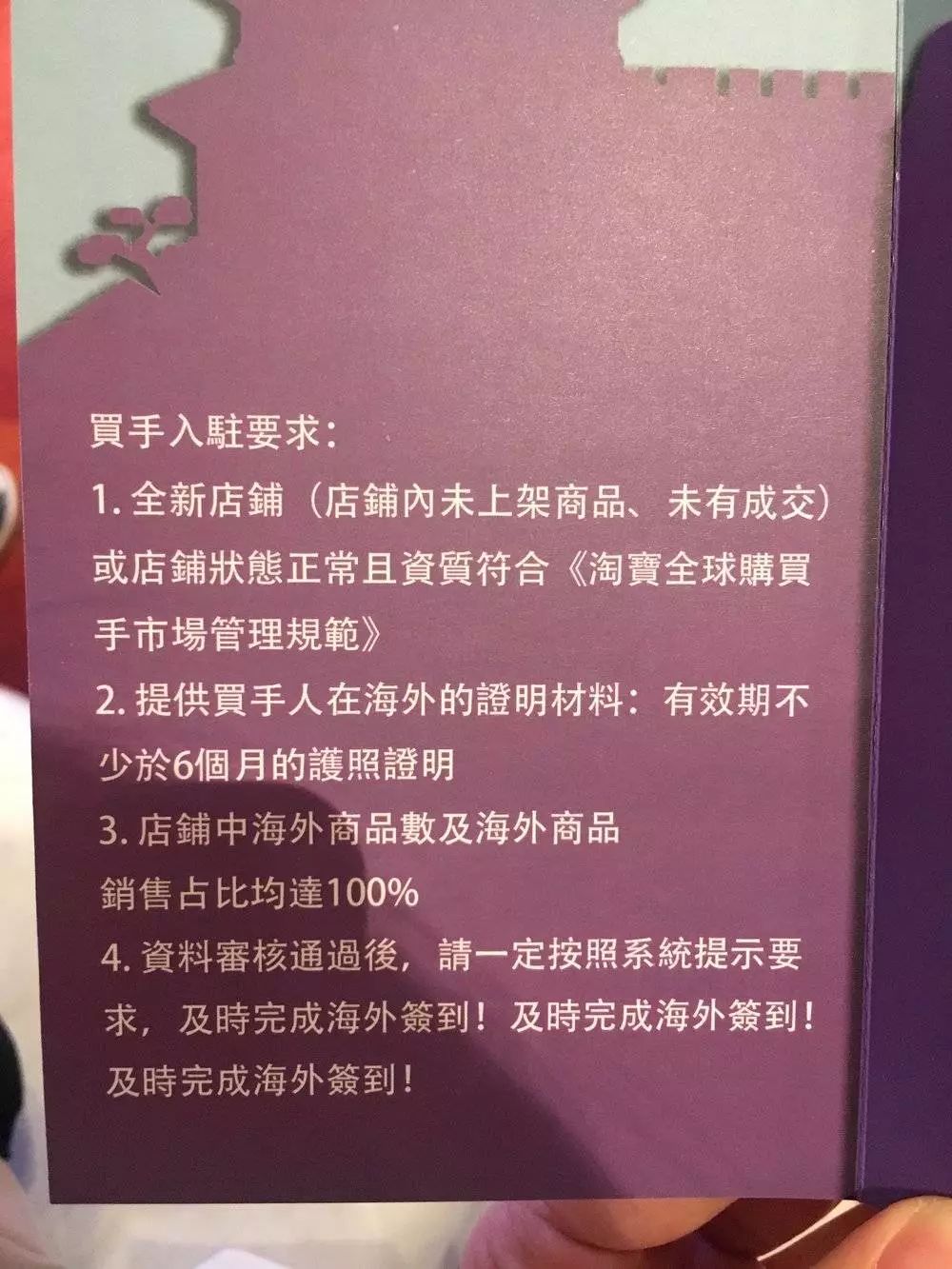 虎嗅在发布会现场拿到的宣传手册上写明了对于买手的详细要求,需提供在海外的身份证明材料,店铺内商品必须100%为海外商品,并且在资质审核通过后,要及时完成海外签到(重要的话说了三遍)。