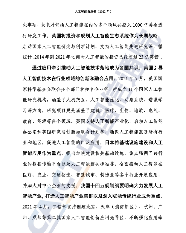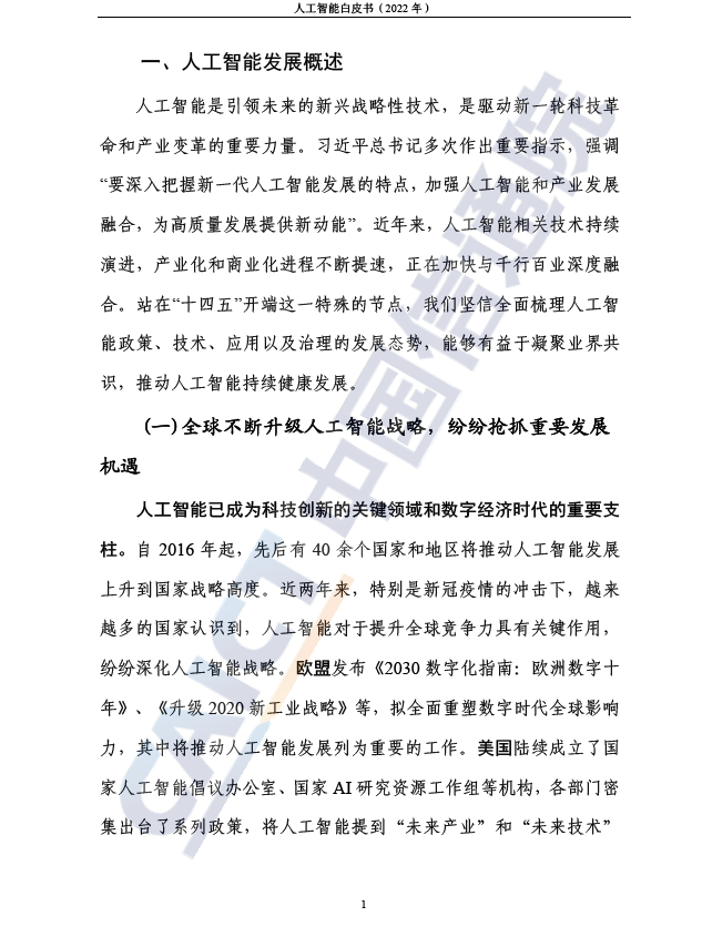 近日,中国信息通信研究院正式发布《人工智能白皮书(2022年)》,全面回顾了2021年以来全球人工智能在政策、技术、应用和治理等方面的最新动向,重点分析了人工智能所面临的新发展形势及其所处的新发展阶段,致力于全面梳理当前人工智能发展态势,为各界提供参考,共同推动人工智能持续健康发展。