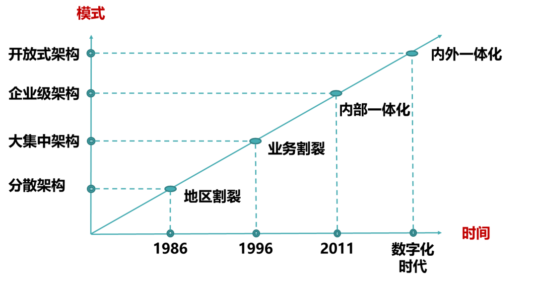 以国内银行为例,其在架构方面的发展历程如下: