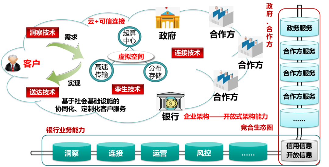 不过,架构的演进不会就此“打住”,内部统一后,银行更重要的是适应面向数字化时代的开放与融合要求,深度参与到生态建设中。这一阶段是开放式架构,真正从社会分工、生态分工的角度,结合生态伙伴、客户情况,综合分析架构解决方案。其设想如下图所示: