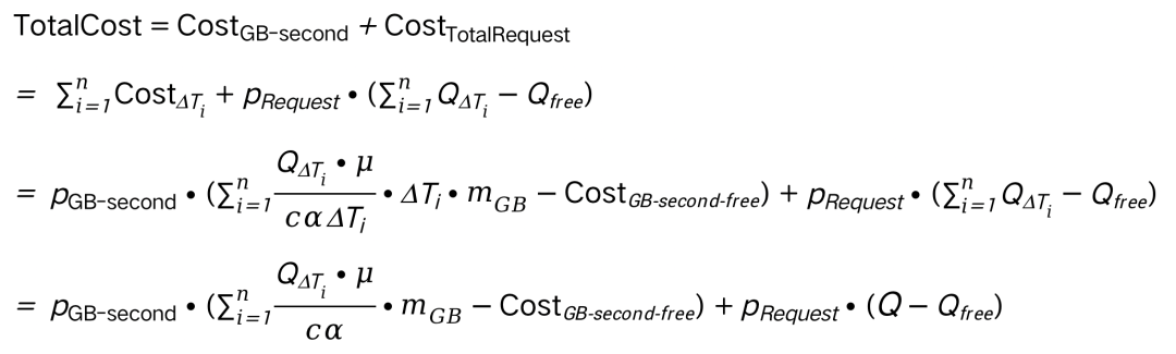 在上式中,单实例并发度c和函数规格可以认为在用户配置之后属于常数;α属于平台侧参数,也可视作常数;对于函数执行时延μ,实际中通常会由于冷热启动差异、网络抖动、调用请求入参等的不同而波动,且考虑到Serverless计费是精确到毫秒级别的,因此严格意义上不能被视作为常数。不过,作为估计模型,这里暂且假定μ也为常数。综上,总成本模型可以表示为: