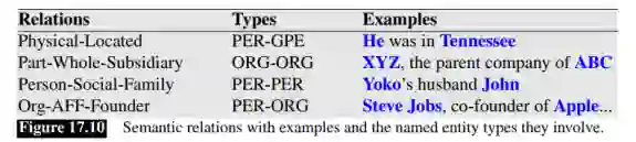 首先做命名实体识别,识别出He(PER)和Tennessee(GPE)两个实体,然后找出两个实体之间的关系:Physical-Located,最后把抽取出来的关系表示为三元组的形式:(HePER, Physical-Located, TennesseeGPE),或者Physical-Located(HePER, TennesseeGPE)。