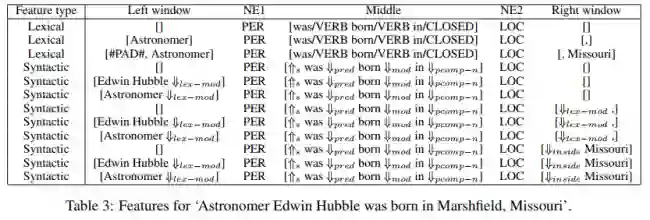 论文中使用了三种特征:词法特征(Lexical features)、句法特征(Syntactic features)和实体标签特征(Named entity tag features)。