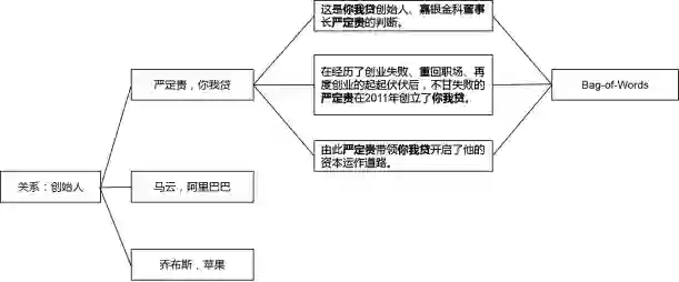 举个栗子,“创始人”是一种关系,如果我们已经有了一个小型知识图谱,里面有3个表达这种关系的实体对:(严定贵,嘉银金科),(马云,阿里巴巴),(雷军,小米)。