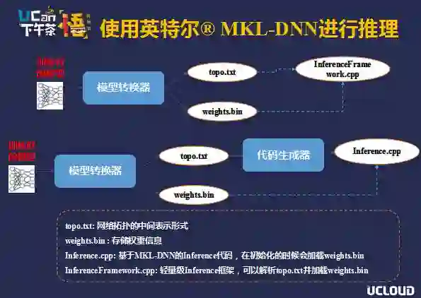 MKL 不同的是,MKL-DNN 是一个开源的深度学习框架。下图为使用 Intel MKL-DNN 进行推理的过程,有两种方式可以实现这个过程,一种是训练好的模型,直接进入模型转换器,然后再用 topo.txt(网络拓扑)生成 Inference.cpp(基于 MKL-DNN 的 Inference 代码,在初始化的时候会加载 weights.bin),这套逻辑需要用到 Intel 自身的网络拓扑模型的中间表示形式。另外一种方式是待 topo.txt 生成后,再用简单的代码转换器,实现轻量级的 InferenceFramework.cpp(轻量级 Inference 框架,可以解析 topo.txt 并加载 weights.bin)。