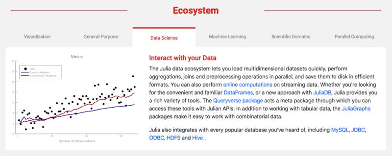 除了语言本身的优点,Julia 还拥有非常强大的生态系统,主要应用于数据可视化、通用计算、数据科学、机器学习、科学领域、并行计算六大领域。