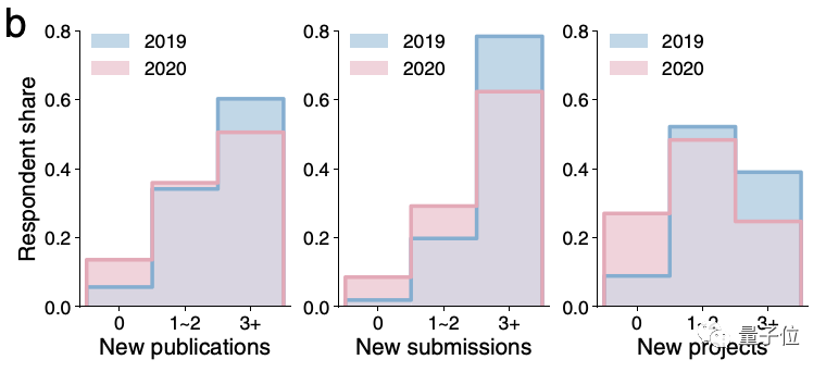 分析结果显示,在2019年时,有9%的科学家没有启动科研项目,但到了2020年,这个数字变为了27%,是2019年的三倍:
