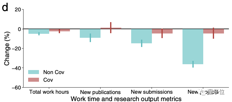 相比之下,非疫情研究领域的科学家的总工作时间下降了5%,新出版物减少了9%,投稿下减少了15%,新项目则减少了36%。