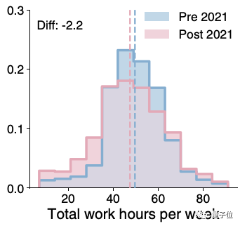 不过这个情况在今年得到了缓解:2021年1月,平均每周的工作时间与疫情前的差异缩短到了2.2小时。