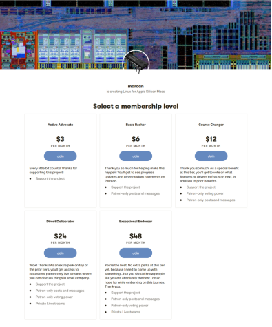 由于设备使用的是全新定制的芯片,因此工作量和投入时间预计将远远超过业余爱好的范围,Hector Martin 计划将这个项目作为他的全职工作。所以,他需要资金的支持。他开通了一个 Patreon 账户,要求每月获得 4000 美元资助,有 3/6/12/24/48 美元这五种筹款等级。