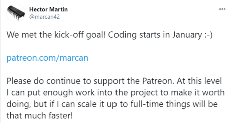 目前该项目的一阶段筹集目标已完成,Hector Martin 也在推特上表示:我们已经达到了启动目标!该项目将在一月份开始。