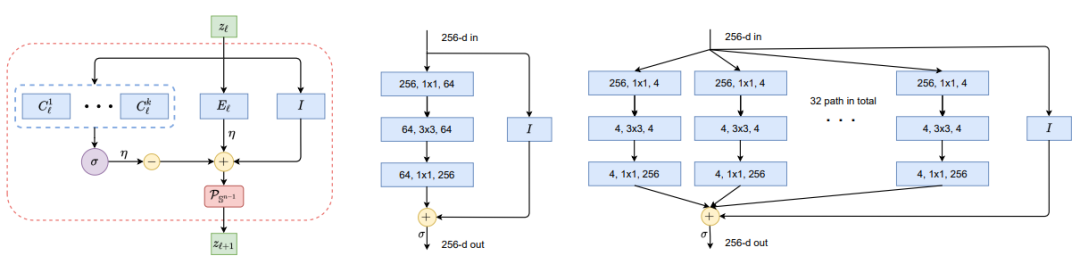 图 5:非线性映射 f 的构建块。图左:ReduNet 的一层,作为投影梯度上升的一次迭代,它精确地由扩展或压缩线性算子、非线性 softmax、跳过连接和归一化组成。图中和图右:分别是一层 ResNet 和 ResNeXt。