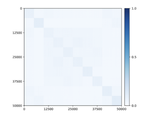 图 9:通过闭环转录,属于 10 个类别 (CIFAR-10) 的 50,000 张图像的无监督学习特征之间的相关性。与类一致的块对角结构在没有任何监督的情况下出现。
