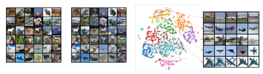 图 8:图左:在 CIFAR-10 数据集(有 10 个类别的 50,000 张图像)的无监督设置中学习的自动编码的 x 与相应解码的 x^ 之间的比较。图右:10 个类别的无监督学习特征的 t-SNE,以及几个邻域及其相关图像的可视化。注意可视化特征中的局部薄(接近一维)结构,从数百维的特征空间投影。