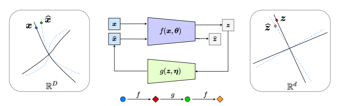 图 6:非线性数据子流形到 LDR 的压缩闭环转录(通过在内部比较和最小化 z 和 z^ 的差异)。这导致了编码器/传感器 f 和解码器/控制器 g 之间的自然追逃博弈,使解码的 x^(蓝色虚线)的分布追逐并匹配观察到的数据 x(黑色实线)的分布。