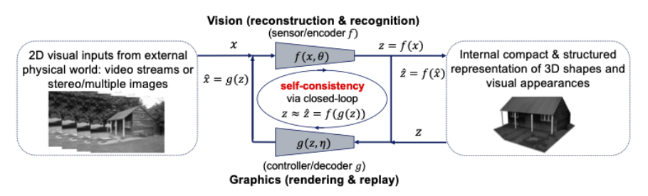 计算机视觉通常被解释为为所有 2D 视觉输入重建和识别内部 3D 模型的前向过程,而计算机图形学表示其对内部 3D 模型进行渲染和动画处理的逆过程。将这两个过程直接组合成一个闭环系统可能会带来巨大的计算和实践好处:几何形状、视觉外观和动力学中的所有丰富结构(例如稀疏性和平滑度)可以一起用于统一的 3D 模型, 最紧凑,且与所有视觉输入一致。