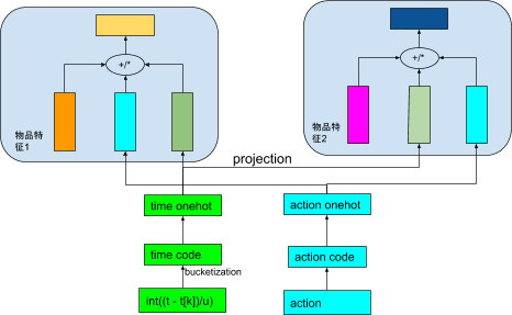 除了物品特征信息之外,我们也可以引入事件上下文信息对用户的时序行为进行建模,主要包括事件发生时间,地点以及事件行为类型。上下文信息的建模方式同离散特征建模方式类似,通常上下文信息取值范围不会太大,可以直接使用 one_hot 编码。上下文信息中事件的时间是比较重要的信息:如前提到的,序列推荐相对于自然语言中的序列模型虽然没有非常强的先后依赖关系,但是对于刻画用户的长期行为和短期行为以及用户行为随时间的变化趋势,时间上下文还是非常重要的。我们通常不直接使用时间戳的绝对值,而是对时间进行分桶,如我们可以在事件发生的时间与目标预测的时间之间取一个相对间隔:,其中 t 是当前目标预测时间戳,