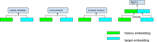 其中 history embedding ( 历史行为向量 ) 表示为 H, target embedding ( 预测物品向量 ) 表示为 T,图4中的几个计算方式可以简单表示为:
