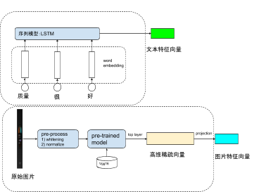 连续型的数值特征可以直接使用,使用前一般会做归一化,使得特征归一到(0,1)之间。物品的文字描述和图片等属于高维特征,通常需要先降维到一个低维度的向量再使用。文字描述一般可以经过分词去停用词等预处理过程,然后将每个词映射为词向量。词向量可使用预训练的词向量模型 ( 如 word2vec,glove ),也可以使用随机初始化的词向量。词向量的序列然后经过 LSTM 等语言序列模型后,生成整个物品的文字描述向量。图片的原始数据通过预处理后经过一个预训练的模型 ( 如 vgg,inception ),取其某一层的输出作为图片向量 ( 如 vgg 的 fc6 )。实际中发现预训练模型的最后几层输出维度比较高但是数据比较稀疏,可以加一个全连接层将高维的稀疏向量映射为一个低维向量,作为最终输出的图片向量。