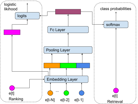 v(a) 是候选物品的向量,上面这个公式即 youtube DNN 做召回的思想:在实际使用中,用 RNN 的输出状态做 k-nearest neighbor search, 得到一个相对较小的候选集合,然后再在这个候选集合中计算每一个候选物品的概率。