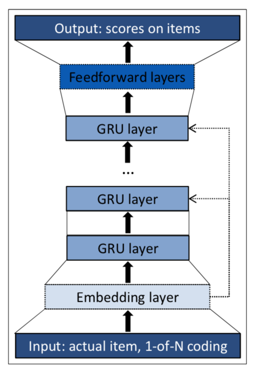 序列中第 N 个时间步输入用户行为物品的 ID,ID 通过 embedding 层映射为向量,并进行归一化。embedding 之后经过一个或者多个 GRU 单元最后接一个 softmax 层获取每个物品的预估概率。为了防止梯度消失的问题,采用了残差网络结构,将上一个 GRU 单元的输出与 embedding 层的输出进行相加,作为下一个 GRU 单元的输入。