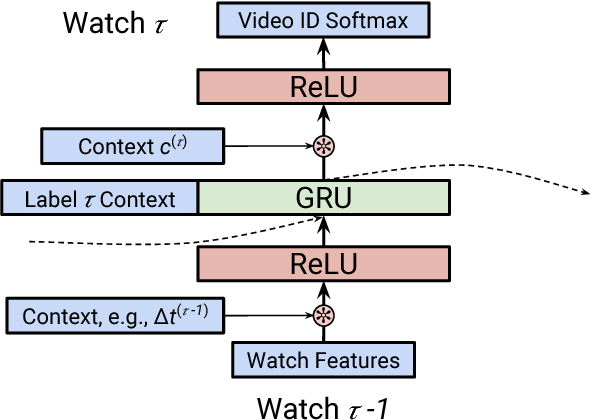1. 第 τ-1 步用户观看视频的物品 feature 和上下文 feature c<τ-1>,两者做 dot product 作为 GRU 层的输入