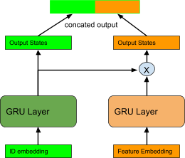 第二种方法是在输出端进行融合:ID 向量和特征向量分别接不同的 GRU,然后将各个 GRU 的输出向量拼接在一起作为最终输出。相比于第一种方法, 这种方法对各个端的特征独立进行建模,在输出端进行拼接后通过后继的全连接层可以隐式加入特征之间的交互。