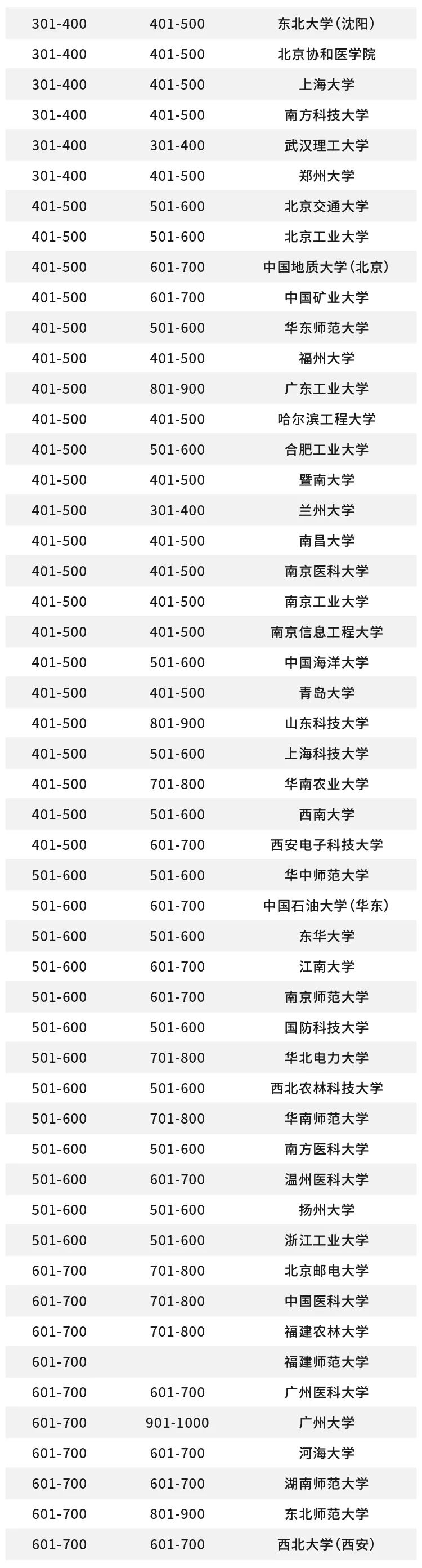 北京理工大学、湖南大学、西北工业大学、北京科技大学首次进入全球前 300。