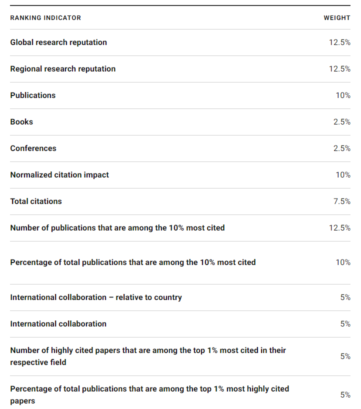 包括:全球研究声誉(12.5%)、地区性研究声誉(12.5%)还有发表论文(10%)、出版书籍(2.5%)、学术会议(2.5%)、标准化引用影响(10%)、总引用次数(7.5%)、国际合作(国家)(5%)、国际合作(5%)。