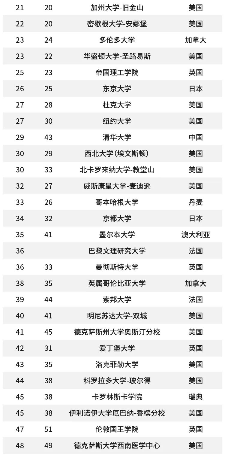 北京大学排名上升 4 名,首次入围全球 50 强,位列全球第 49。