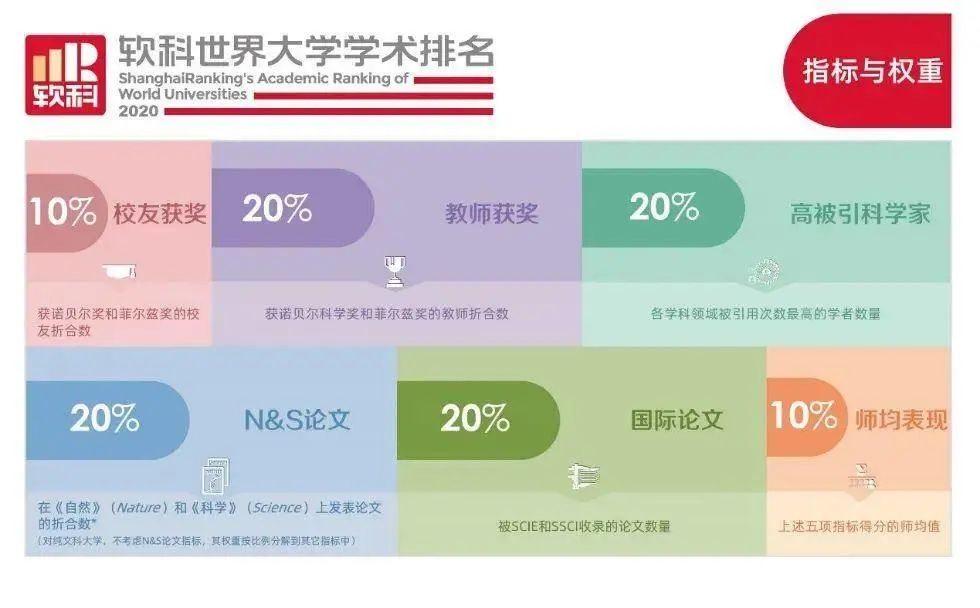 但 ARWU 的排名依据却不同,它没有任何声誉占比,6 项指标全部都与学术相关,硬核程度相当之高。