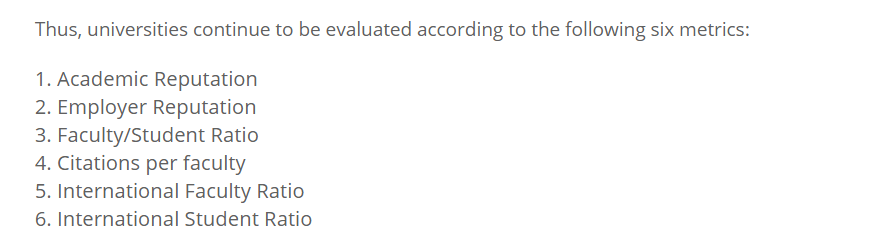除此之外,还有教师/学生比例(20%)、论文引用数(20%)以及国际教师比例和国际学生比例(各占 5%)。