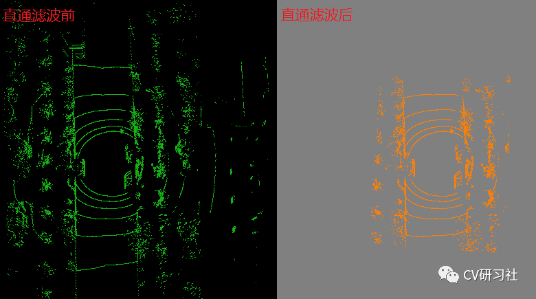 原理:在点云的指定维度上设置一个阈值范围,将这个维度上的数据分为在阈值范围内与不在阈值范围内,从而选择过滤与否。能够快速过滤掉用户自定义区间范围内的点云。