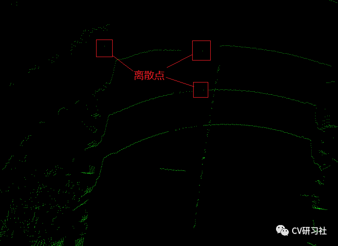 如下图所示:由于设备采集或者障碍物遮挡等问题或导致在三维空间中出现零星的点集。