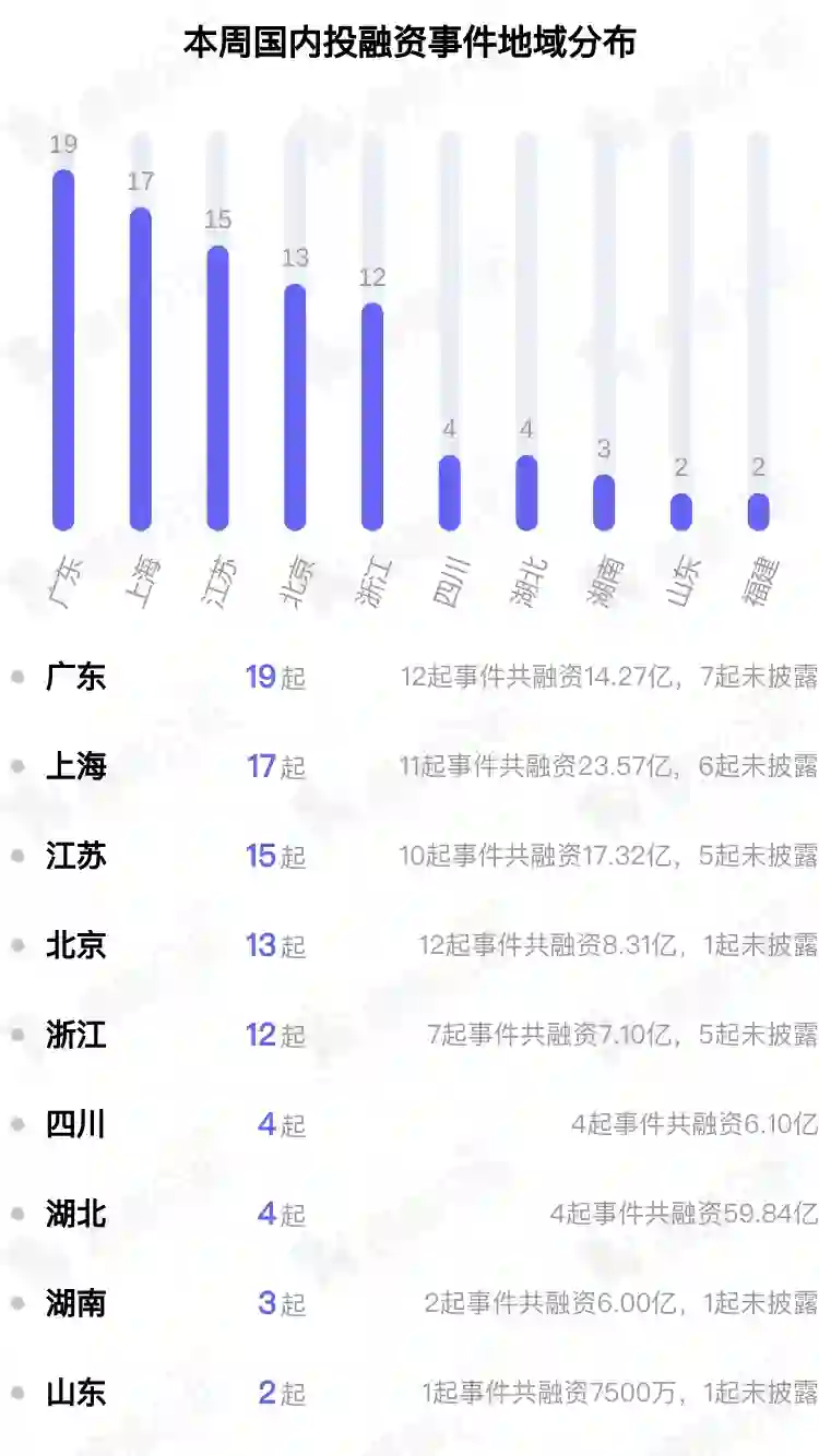 从本周披露获投企业的地域分布来看,主要集中在广东、上海、江苏。