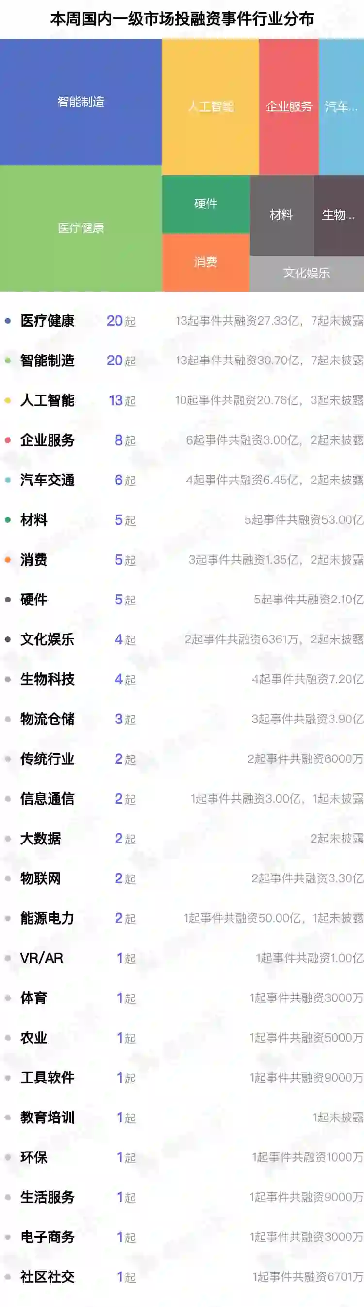 医疗健康(20个)、智能制造(20个)、人工智能(13个)领域融资最为活跃